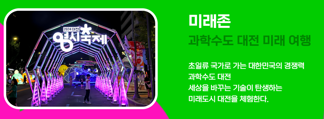 미래 존에서는 VR, 4D 우주여행 체험버스, 대전 미래과학체험관 등 첨단 과학 체험이 가능합니다.