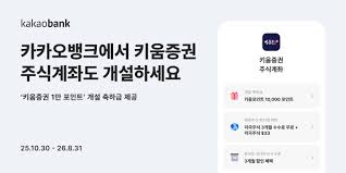 카카오뱅크 앱으로 키움증권 주식계좌를 처음 개설한 고객에게 1만 키움증권 포인트가 지급됩니다. 이 포인트는 현금처럼 사용할 수 있으며, 지급 시기는 계좌 개설 완료 후 확인 가능합니다.